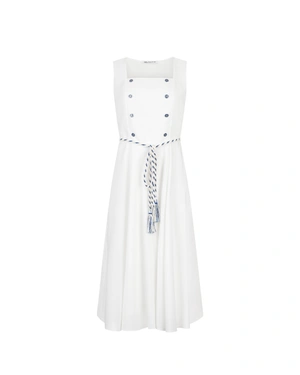 Sleeveless model with a square neckline, double-row decorative buttons, and a twisted two-tone cord belt. The bodice is fitted, and the skirt is slightly flared, mid-calf length. Contains a high percentage of certified viscose, sourced from sustainably managed plantations, contributing to the preservation of natural resources. The chosen material ensures durability and high quality of the garments.