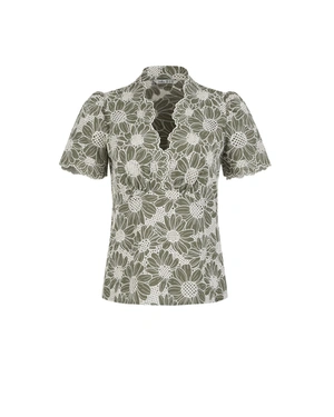COTTON BLOUSE WITH A V-NECKLINE AND CONTRASTING FLORAL EMBROIDERY IN GREEN