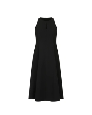 A design with a round neckline, sleeveless, featuring a fitted bodice and a flare down to mid-calf length, with a keyhole opening at the neckline. The fabric has a slight elasticity.