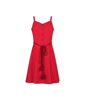 Letnja haljina u crvenoj boji, od 100% pamuka, sa naramenicama i prednjim kopčanjem na dugmad, prišivenim steznikom i lepršavom suknjom, iznad kolena. Struk je naglašen dvobojnim tordiranim kaišem od gajtana.