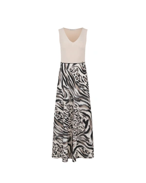 Duga haljina bez rukava sa V-izrezom; svetlo bež gornji deo je napravljen od viskoznog žerseja kako bi se istakla silueta, dok suknja A-kroja do članka ima životinjski print u mekoj, eteričnoj tkanini.