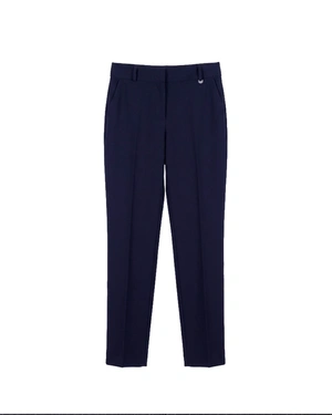 Modèle à jambe fuselée avec pli marqué, coupe ajustée normale, en noir.